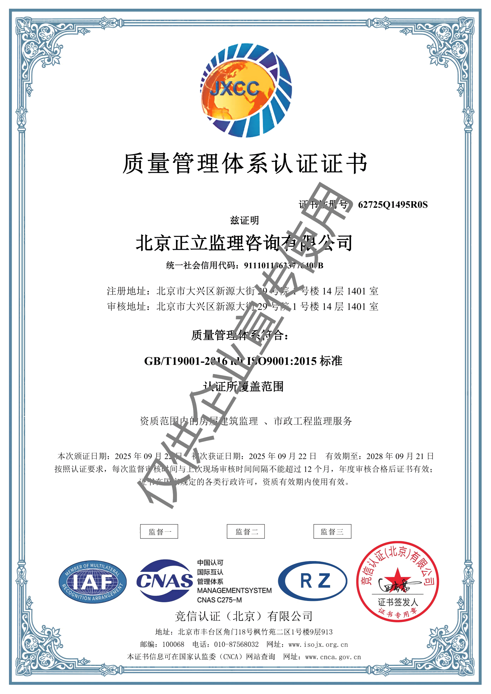 北京正立監(jiān)理咨詢有限公司成立于1998年7月1日,其前身隸屬于北京市公路質(zhì)量監(jiān)理站。具有獨(dú)立法人資格,是獨(dú)立核算、自負(fù)盈虧的經(jīng)濟(jì)實(shí)體。企業(yè)經(jīng)營范圍:公路工程監(jiān)理、交通工程監(jiān)理、市政公用工程建設(shè)監(jiān)理、工業(yè)與民用建筑工程監(jiān)理、工程監(jiān)理咨詢、技術(shù)咨詢、技術(shù)培訓(xùn)等。